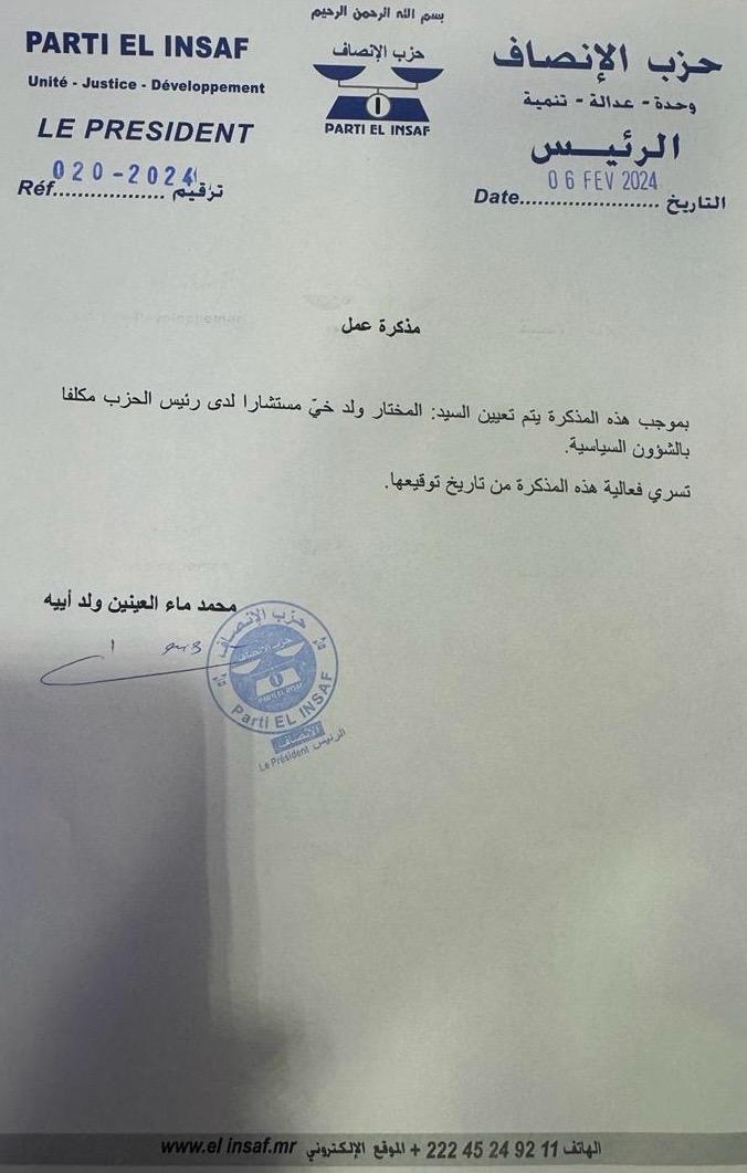 أصدر رئيس حزب الانصاف السيد، محمد ماء العينين ولد أييه مذكرة بموجبها تم تعيين العمدة السابق لبلدية بومديد السيد، المختار ولد خيه مستشارا مكلفا بالشؤون السياسية .