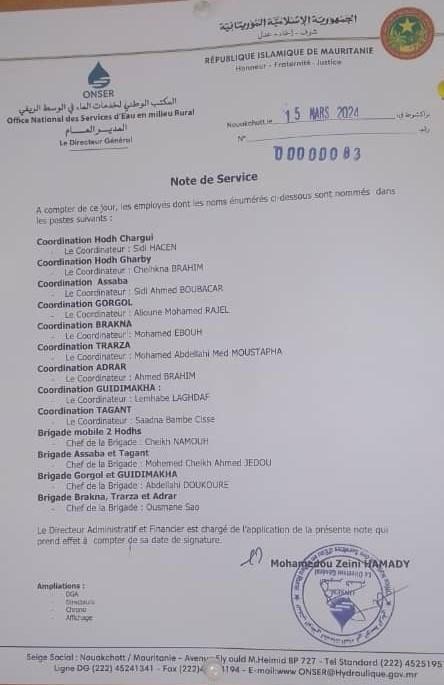 بموجب مذكرة صادرة عن المدير العام للمكتب الوطني لخدمات الماء في الوسط الريفي المعروف اختصار ب ( ONSER ) تم تحويل السيد، سيد أحمد بوبكر منسقا للمكتب على مستوى ولاية لعصابه .