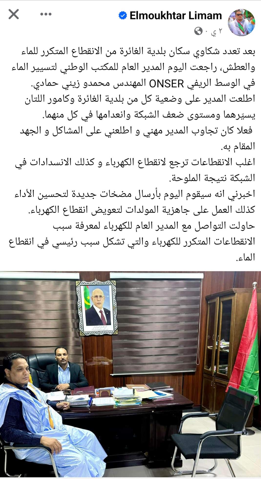 Mar 20 / التعليقات كرو : أحد النواب يكتب عن الماء و الكهرباء في بلديتي الغايرة وكامور ( تفاصيل ) كتب نائب مقاطعة كرو لولاية لعصابه المختار ولد لمام ما يلي عن انقطاعات الكهرباء والماء في الغايرة وكامور .
